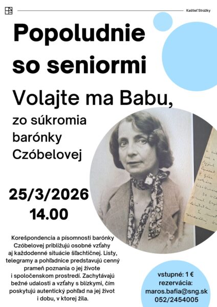 SNG Kaštieľ Strážky-Popoludnie so seniormi, 25.3.202618. marca 2026Popoludnie so seniormi / Volajte ma Babu, zo súkromia barónky Czóbelovej streda 25.03. 2026 / 14.00 Korešpondencia a písomnosti barónky…