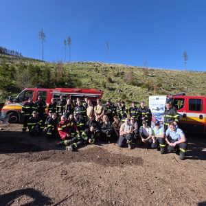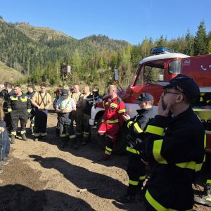 Lesný požiar (27. 04. 2025) – nácvik zásahu v náročnom horskom teréne s využitím špeciálnej techniky vrátane dronov a vysokotlakových zariadení.