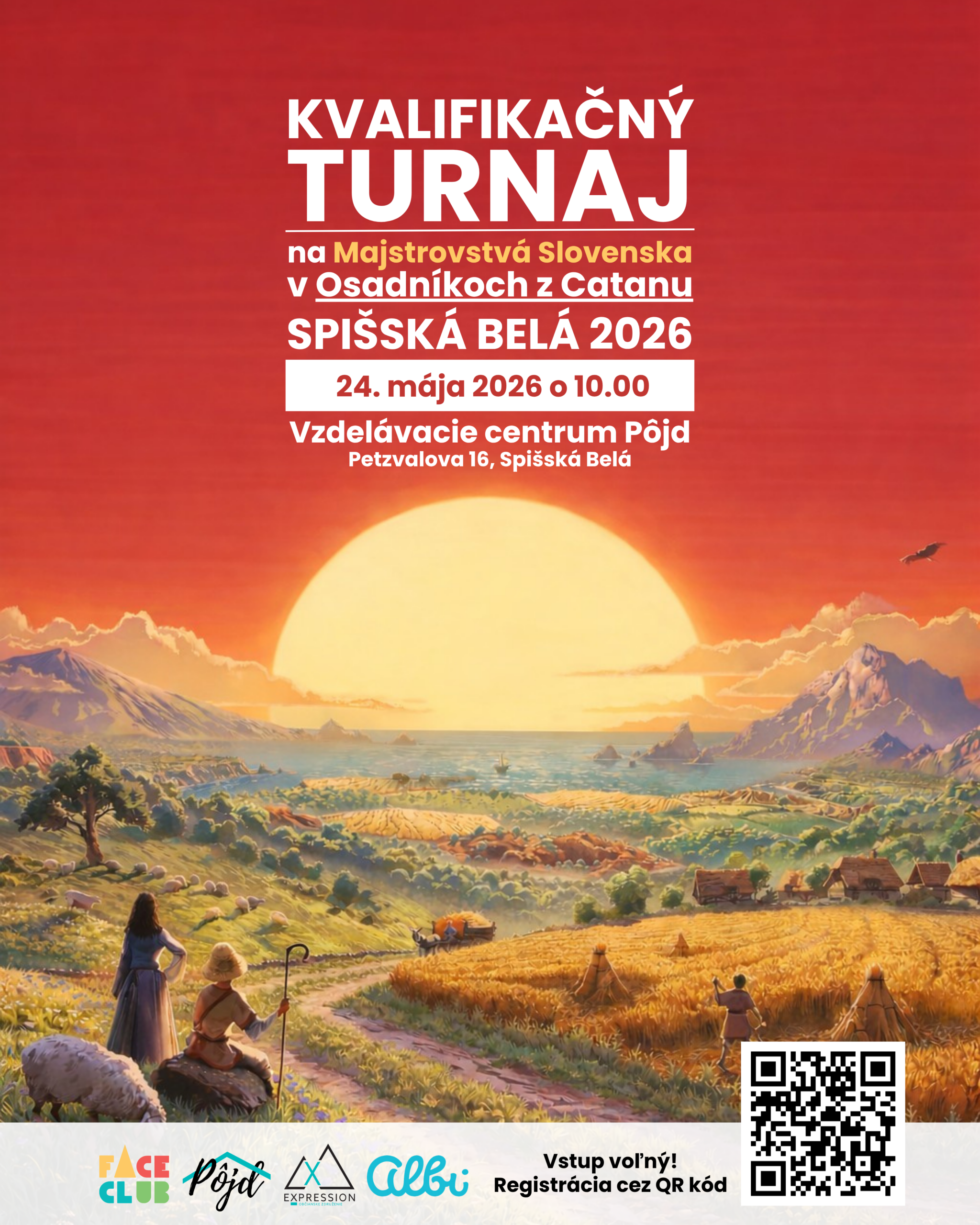Pozývame všetkých fanúšikov doskovej hry Osadníci z Catanu na kvalifikačný turnaj, ktorý sa uskutoční 24. mája 2026 o 10:00 vo Vzdelávacom centre Pôjd na Petzvalovej 16 v Spišskej Belej.
